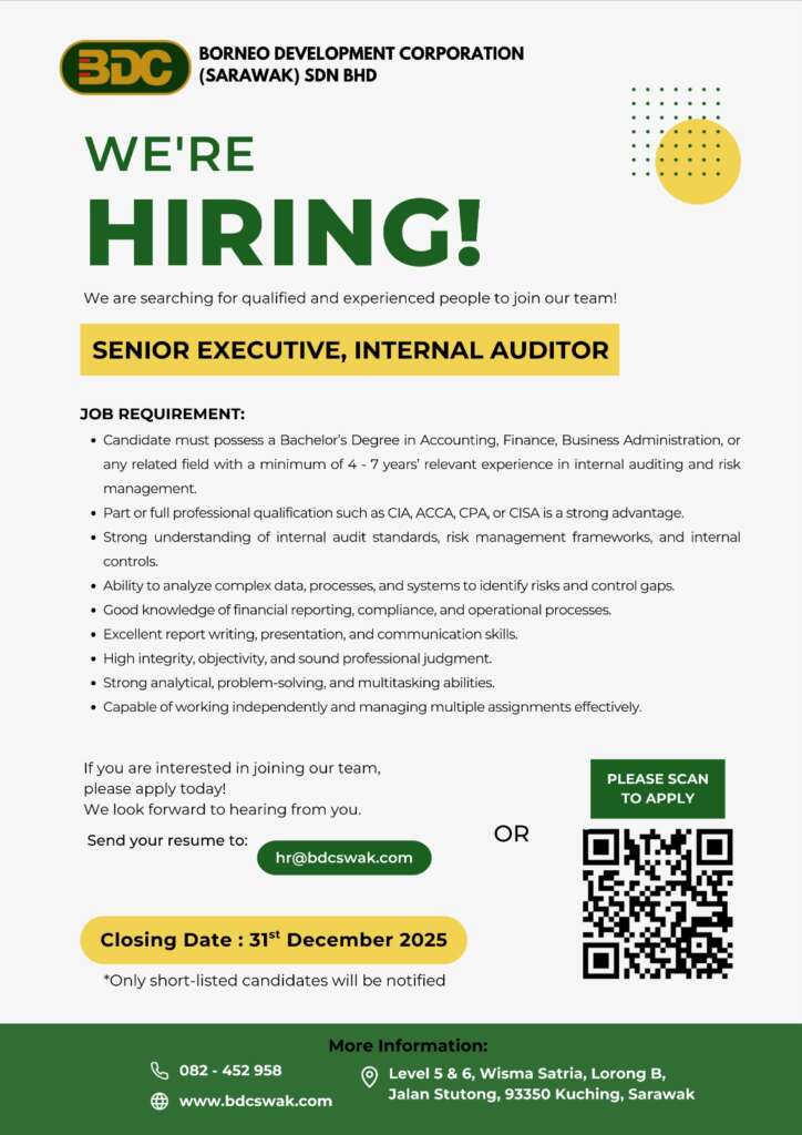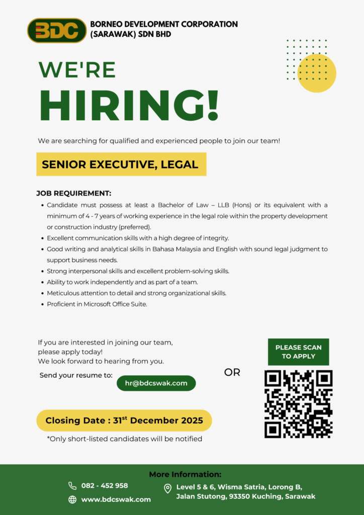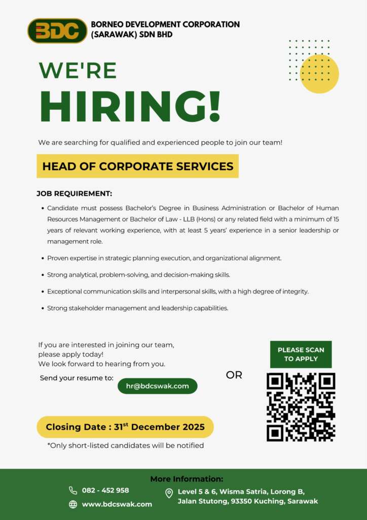 Borneo Development Corporation (Sarawak) Sdn Bhd is seeking for highly motivated and experienced people to join our growing team. This is an exciting opportunity for skilled candidates to play a vital role in building and achieving our Corporate goal!